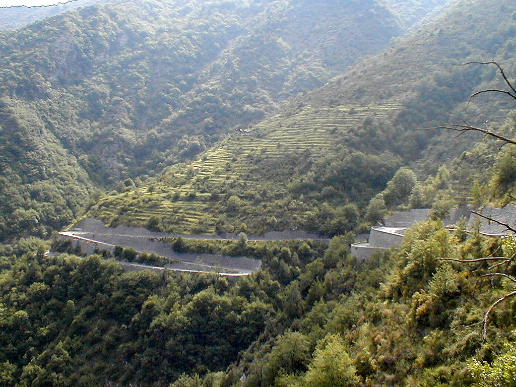 Mit aufwendige Bauten musste die Straße an die Schluchtwand gesetzt werden. Durch die Mauerwerke ist der Straßenverlauf in der Ferne so gut auszumachen wie kaum an anderen Pässen gesehen.