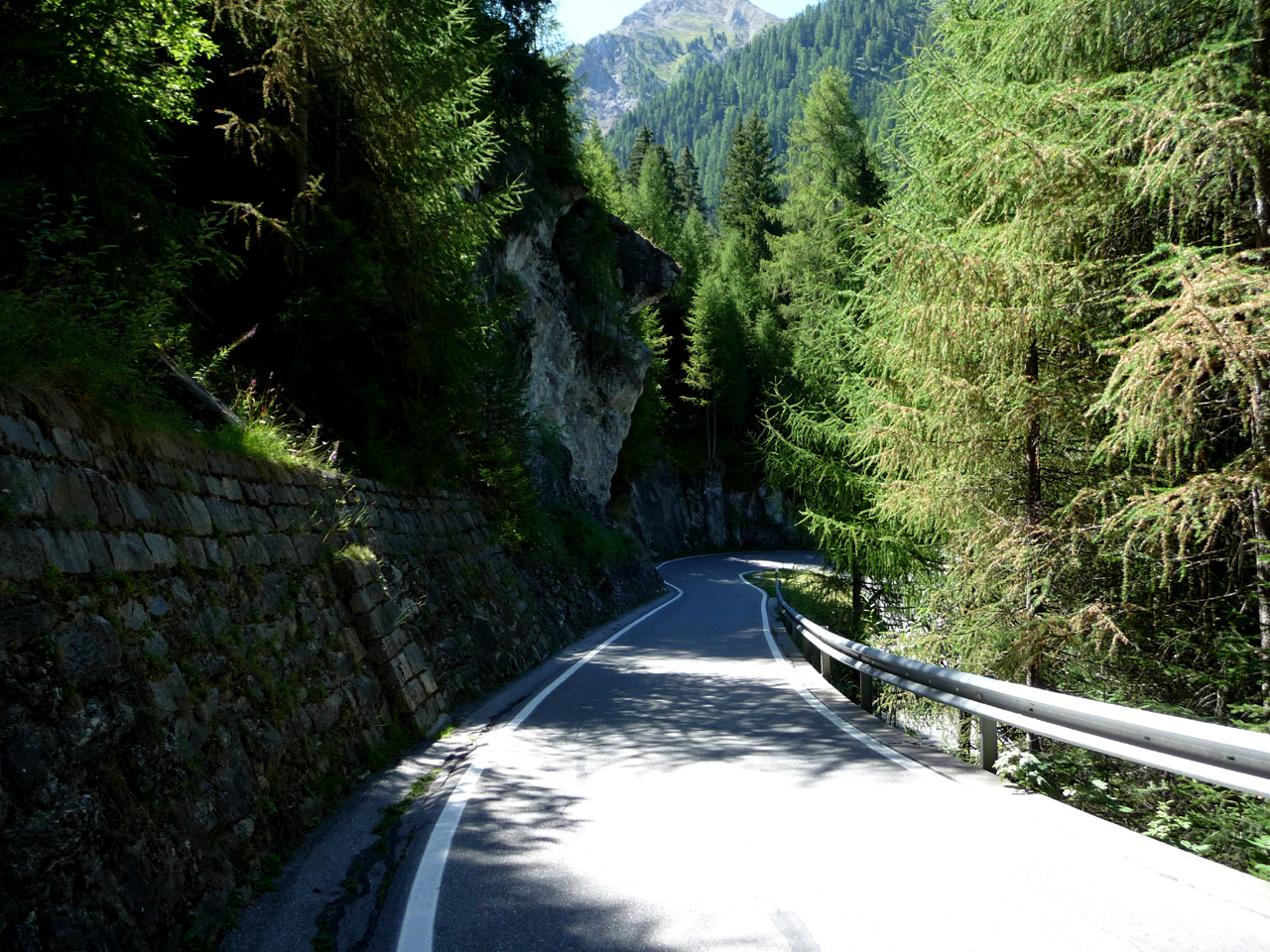 Im unteren Bereich der Umbrail-Nordrampe wird die Straße mitunter sehr schmal, und führt auf vielen Kehren durch dichten Nadelwald.