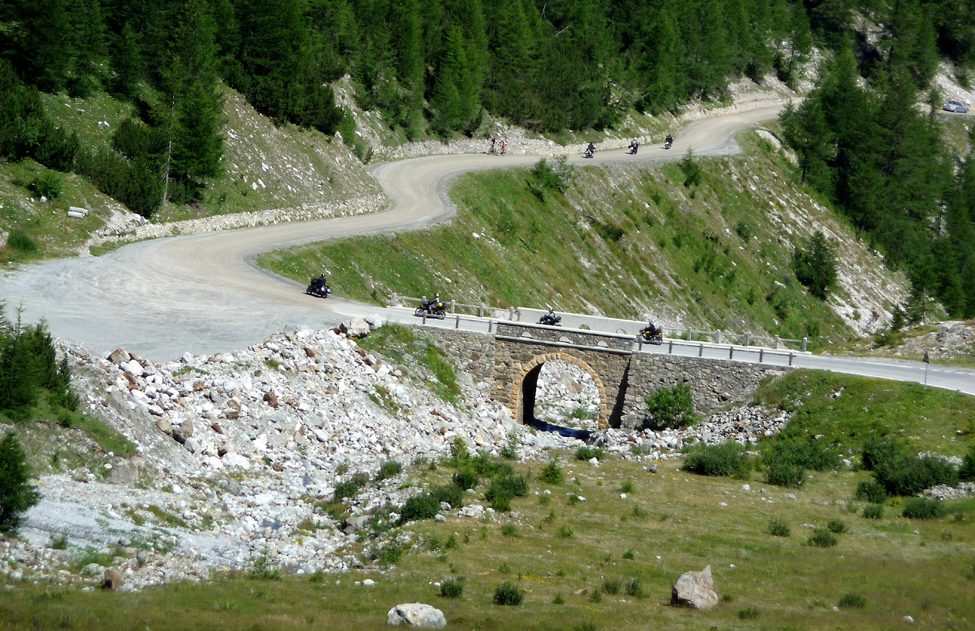 Zoom-Aufnahme der kleinen Steinbrücke in der Mitte der Umbrail-Nordrampe. Von oben kommend beginnt dort der Schotterbelag, für die von Süden anreisenden Biker fangen die schönen Asphaltkehren im oberen Teil an.