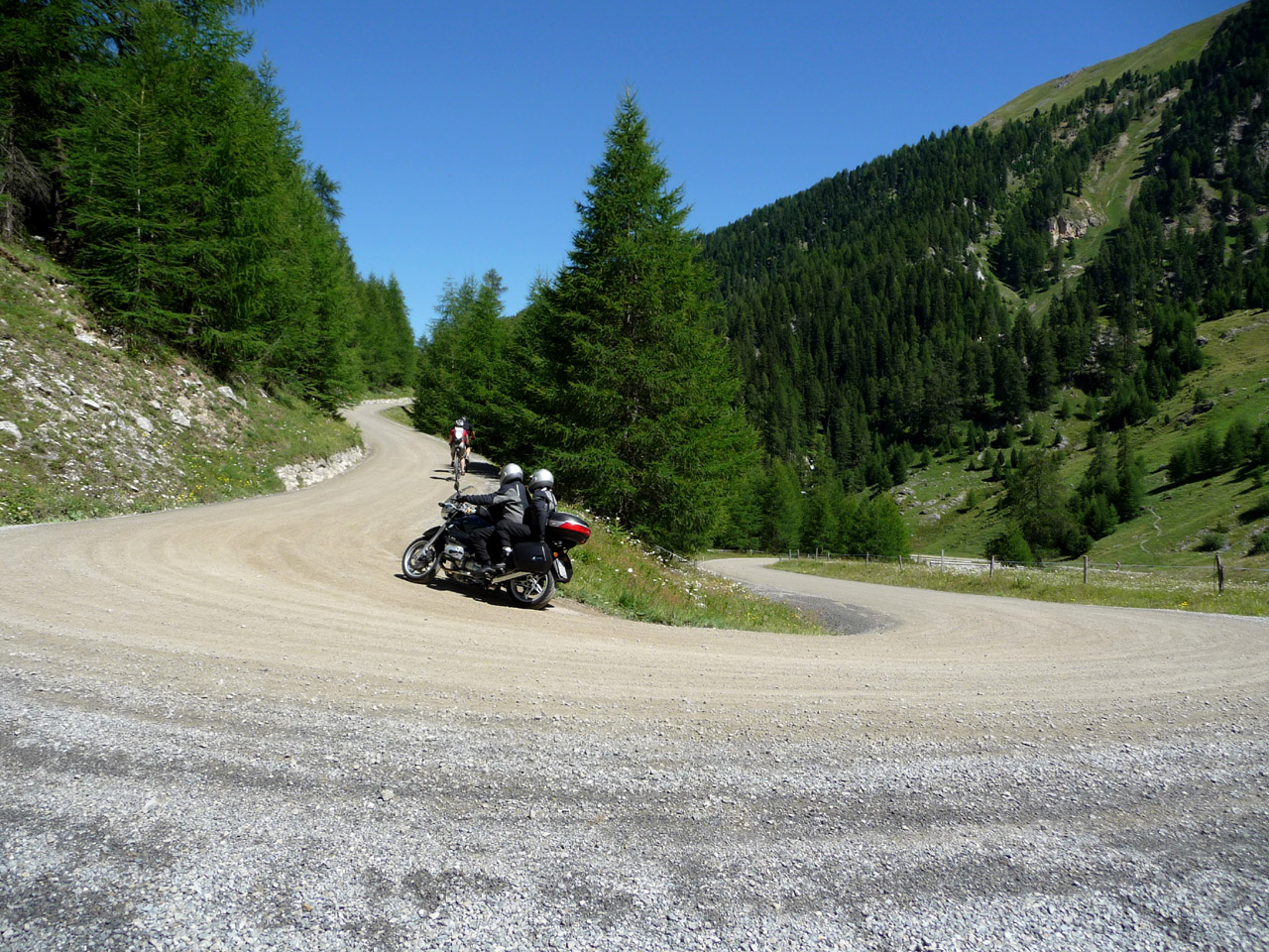 Eine der Kehren im geschotterten Bereich. Wie man sieht, es geht auch mit guter Beladung und Straßenbereifung. Der Schotterbelag hat auf der ganzen Strecke die gleiche Konsistenz und ist recht einfach zu fahren.