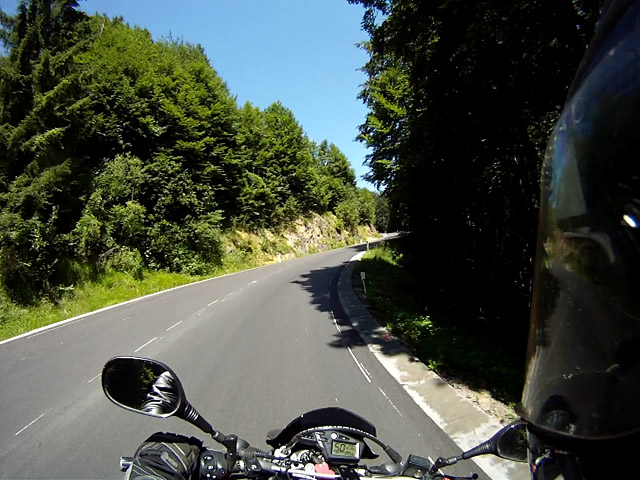 die Straße führt ein paar Kilometer auf kurvigem Weg durch grünes Gebiet.