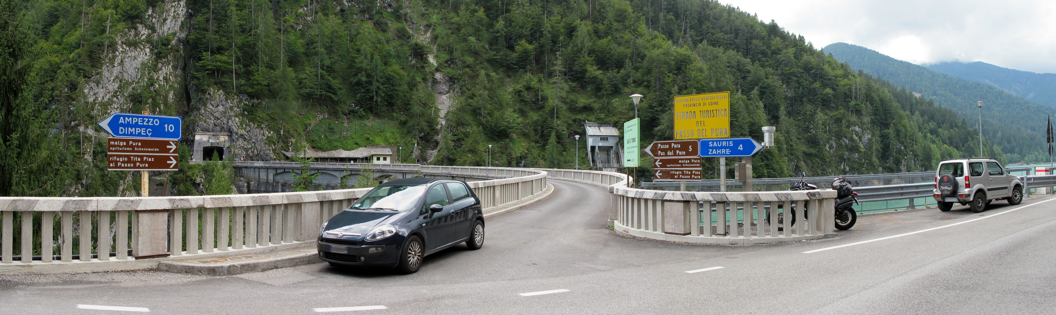 Über die Staumauer des Lago di Sauris geht es hoch zum Passo Pura, das Auto ist unterwegs ins von Tunneln durchzogene und sehr kurvenreiche Val Lumiei.