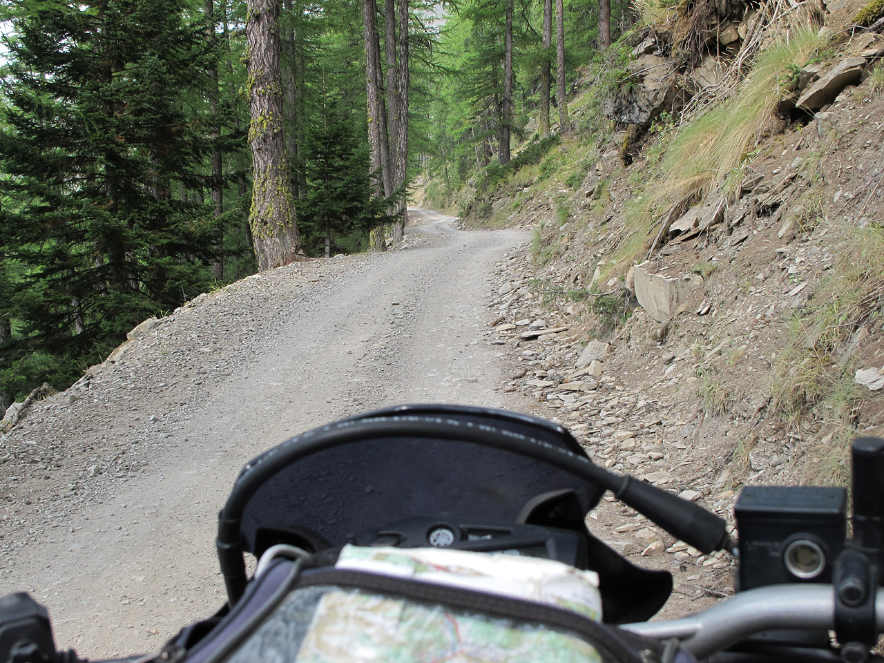 Die Westrampe des Valbelle(i) liegt in dichtem Wald, während der Belag aus feinem und erdigen Schotter besteht.