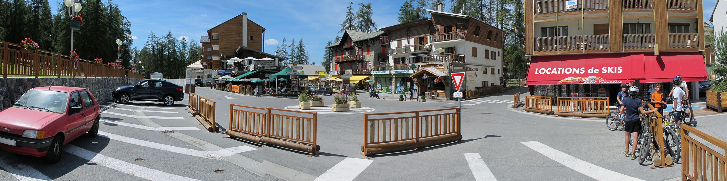 Der Kreisverkehr liegt im Ort Valberg knapp unterhalb der als solche ausgeschilderten Passhöhe des Col de Valberg, gleich zu Anfang wenn man aus westlicher Richtung kommt (hier von links). Rechts der Bildmitte geht es weiter nach Osten, ein Stück links der Bildmitte wieder zurück nach Westen und auf die schöne Strecke durch den Ort Péone. Die Einfahrt ist leicht zu übersehen, da man von Westen kommend im Touristengetümmel um 179 Grad nach links abbiegen muss.