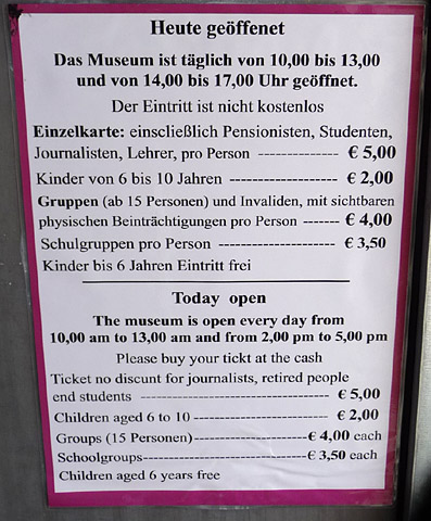 Preisliste für die Besichtigung des Bunkers, Stand Sommer 2010.