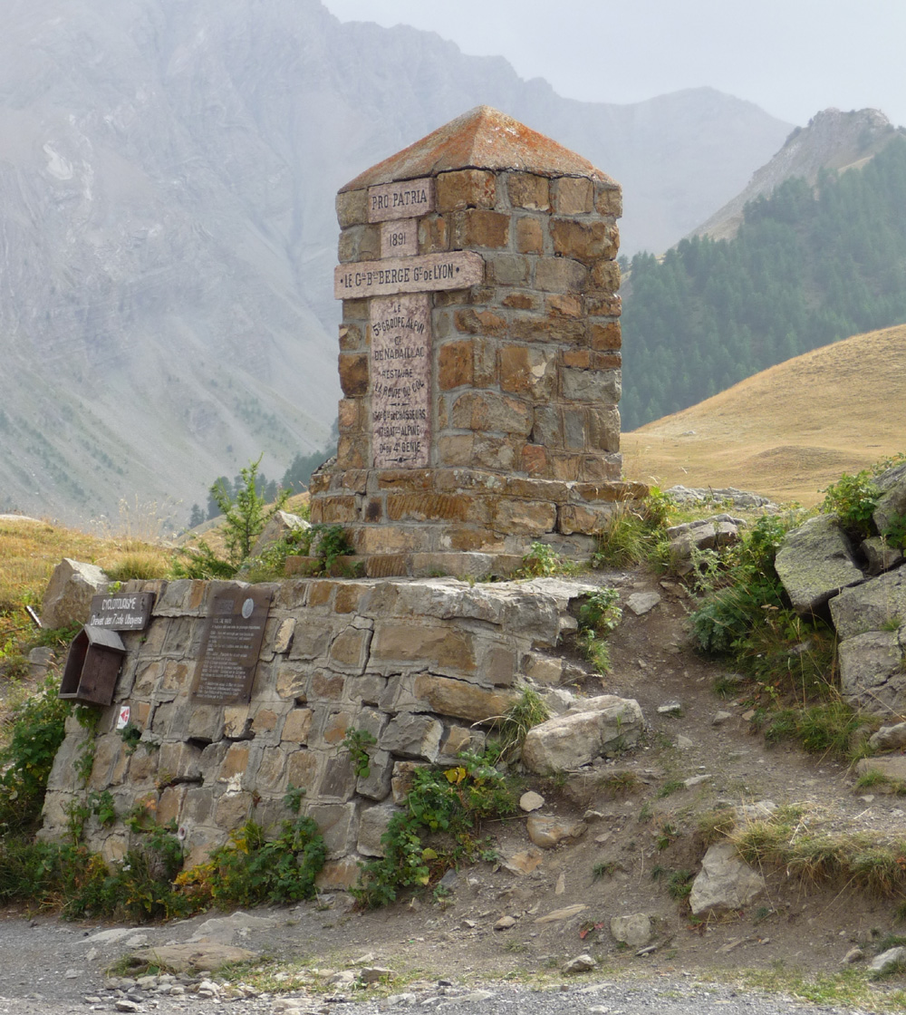Der Gedenkstein auf der Passhöhe des Col de Vars, aufgenommen bei halbwegs guten Lichtverhältnissen.