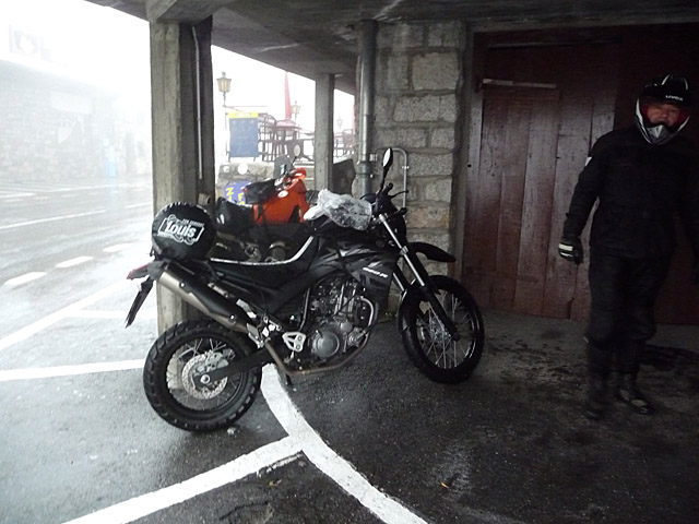 Am letzten Tag schüttete es in Strömen und wir haben am Grimselpass kurz Pause machen müssen. Unterschlupf fanden wir unter dem Hotel Grimselblick, links im Dunst ist der Eingang zur Kristallgrotte zu erahnen. Wir waren sehr zufrieden ...