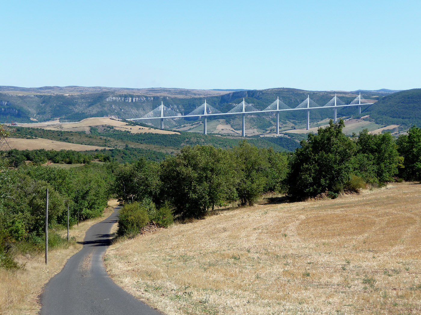 Blick von einer kleinen Nebenstraße in nordwestlicher Richtung aus. Das südliche Ende der Brücke ist im Bild rechts zu sehen, der Ort Millau ist nicht im Bild, er befindet sich links hinter den hellen Bergen in der Schlucht.