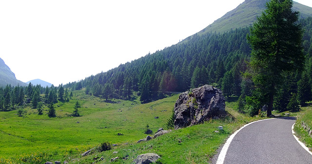 Ist der steile Part geschafft, kommt man oben "plötzlich" in den offenen Bereich. Noch ein paar Kilometer durch immer kahler werdende Landschaft, und die Passhöhe ist erreicht. Die befindet sich irgendwo vor dem schemenhaften Berggipfel links im Bild.
