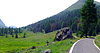 Die Westrampe macht im Prinzip da weiter, wo die Ostrampe aufgehört hat. Erst schlängelt sich die Straße durch mehr offene Landschaft langsam bergab, vorbei an grünen Wiesen. Wie auch auf der Ostrampe kommt danach ein Teilstück, in dem die Straße hart an den Fels gebaut wurde. Die Straße ist Anfangs wie gewohnt nur eine Fahrspur breit und in dem schluchtigen Part zwischen Felswand und Sicherheitsbegrenzung eingeengt.