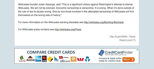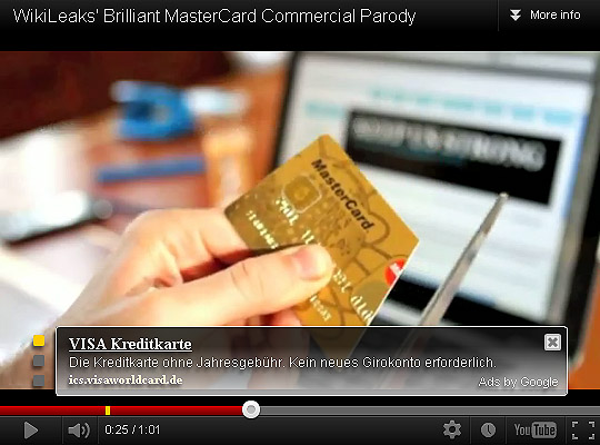 Hintergrund: Nach der aufschlußreichen Veröffentlichung des Collateral Murder Videos, bei dem unter anderem mehrere Zivilisten vom Helikopter aus nicht weniger als niedergemetzelt wurden, haben VISA und MasterCard sämtliche Spendenkonten von WikiLeaks gesperrt bzw. Spenden nicht weitergeleitet. Nebst anderen namhaften Vereinen unter US-Einfluß, wie z.B. PayPal, Western Union.