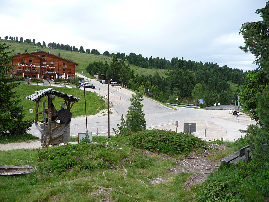 Blick auf die Passhöhe, aus südlicher Richtung. Links oben ist die Unterkunft Albergo Alpino Ütia De Börz zu sehen, rechts geht es auf die Ostrampe.