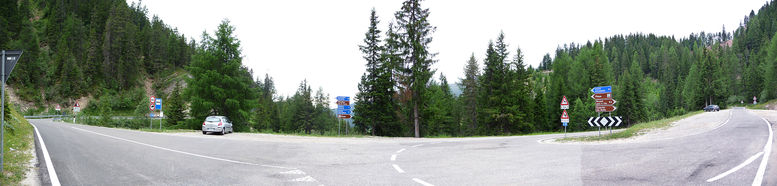 Auf der Mitte der Westrampe trifft die 'offizielle' Westrampe mit einer etwas weiter nördlich verlaufenden Alternative zusammen. Links geht es ins Tal nach Funes/Villnöß, in der Mitte nach Brixen und zur Plose, rechts weiter bergauf zur Passhöhe.
