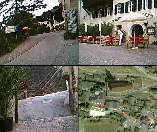 Die Straßenführung im untersten Teil der Westrampe ist etwas seltsam. Erst fährt man in eine Hotel-Einfahrt (links oben), steht dann vor dessen Terasse (rechts oben) und drängelt sich dann durch eine schmale Lücke zwischen den Häusern durch (links unten). In der Luftaufnahme habe ich den gefahrenen Weg mit Punkten markiert, die drei Pfeile stellen die Aufnahmeorte der drei Fotos dar. Man kommt von rechts unten, dreht links der Bildmitte und fährt dann nach oben rechts.