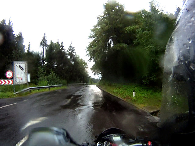 Ich hatte gerade noch genügend Zeit, mich über das "Bitte in den ersten Gang zurückschalten"-Schild lustig zu machen, schon schlidderte ich mit blockierendem Hinterrad Richtung Leitplanke. Die Bremswirkung bei 18% Gefälle und klatschnasser Fahrbahn ist vernachlässigbar gering.