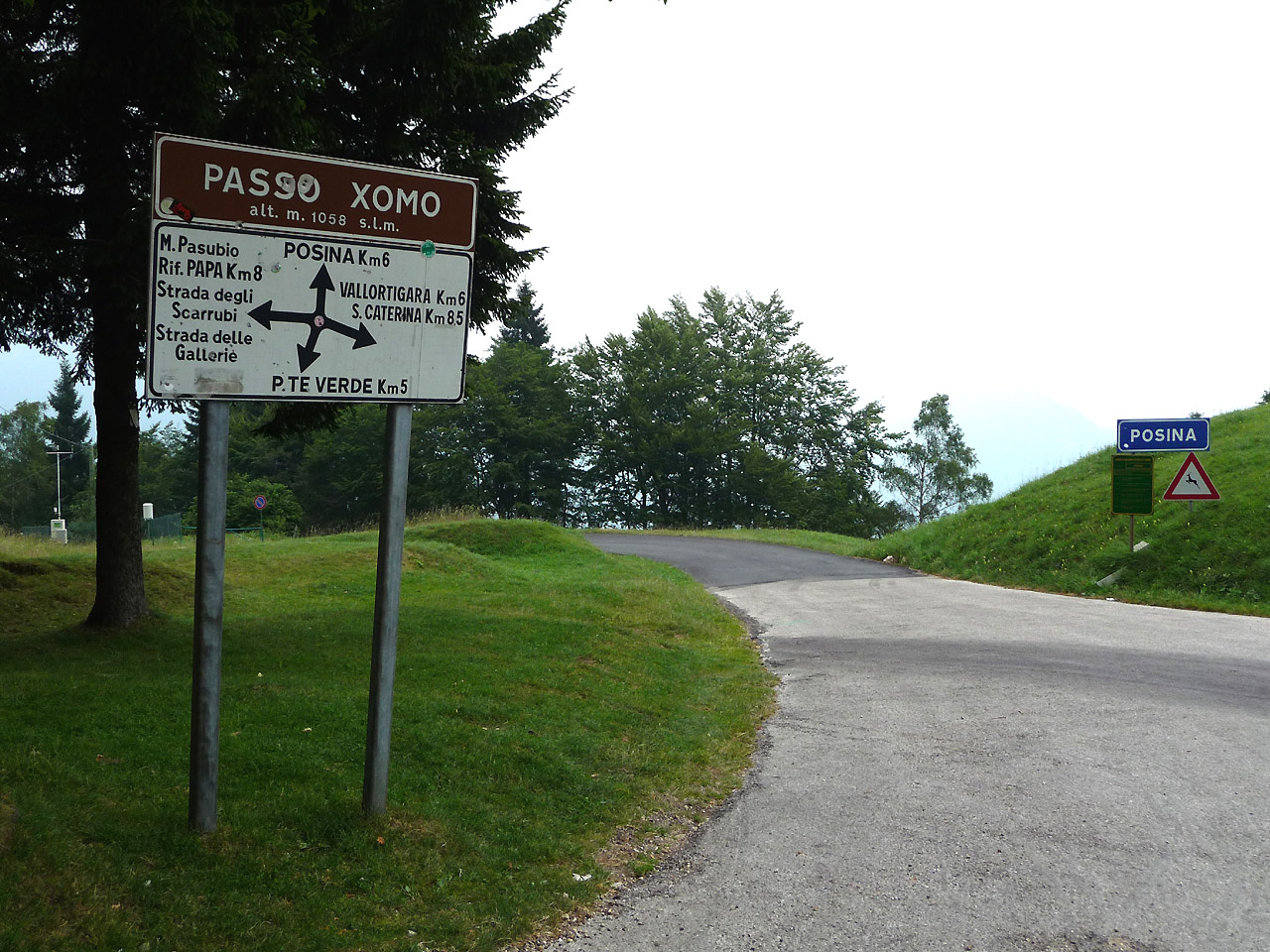 Der Blick ist nach Nordosten gerichtet, auf die nach Posina führende Rampe. Links außerhalb des Bildes steht das Rifugio Passo Xomo, die große Kreuzung befindet sich im Rücken des Betrachters.