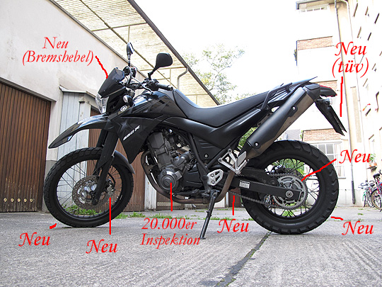 Zwei neue Reifen + Schläuche, neues Kettenkitt, komplette Inspektion, neue Bremsbeläge, neuer Bremshebel (!). HEI - DER - DAUS, der Spaß hat mich fast 1000 Euro gekostet (in Worten: EIN - TAU - SEND). Gut, ich hätte außer Bremsbeläge, Bremshebel und TÜV mehr selber tauschen/erledigen können. Auch Reifen + Kette hätte ich nicht beim Händler, sondern beim Reifenhändler wechseln lassen sollen. Irgendwie war ich ein klein wenig zu faul. Aber bei den Kosten werde ich bei der 30.000er Inspektion wohl doch die ein- oder andere Arbeit selbst in Angriff nehmen.